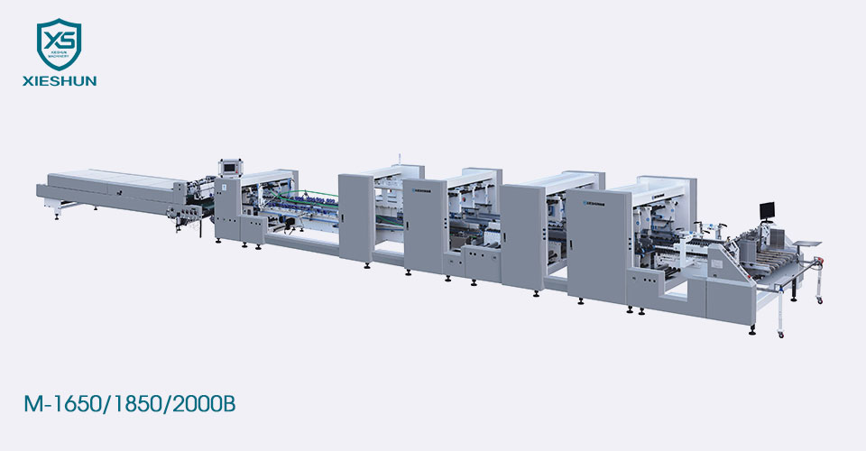 Kina Xieshun M-1650/1850/2000b Automatisk kraftig bølgepunkt Bunnlås-mappe Gluer, bruk PLC og importerte elektroniske komponenter, mater med uavhengig servomotor, interiørplate flyttes ved hjelp av lineære guider for å sikre presisjon og enkel drift.